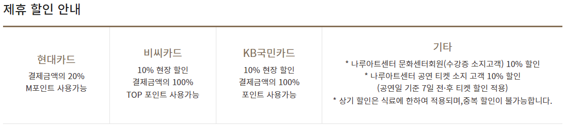 하지만 제휴할인을 이용하기 쉬운 편이며, KB국민카드나 비씨카드가 없다면 네이버 예약만 해도 10% 할인이 가능하다.